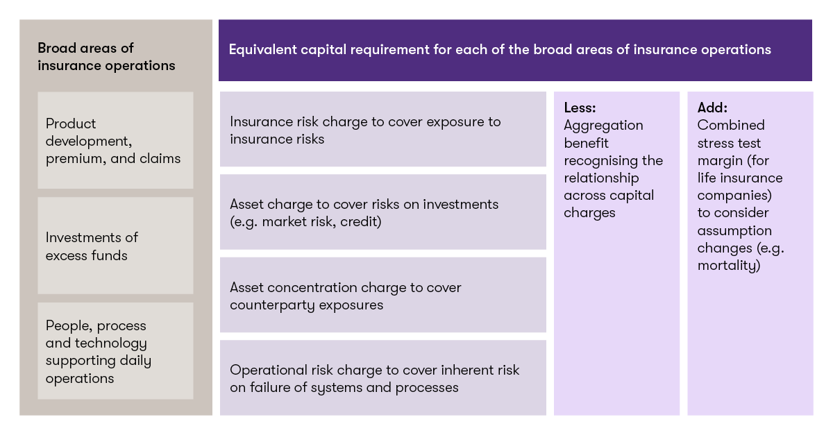 The new capital framework requires all insurers to calculate their prudential capital requirements based on the new guidance and formula for each of the equivalent capital charge. While the calculation may involve some complex mathematical calculations, each of the capital charges can be mapped to the broad areas of insurance operations and relating them to the various risks that an insurer is exposed to.