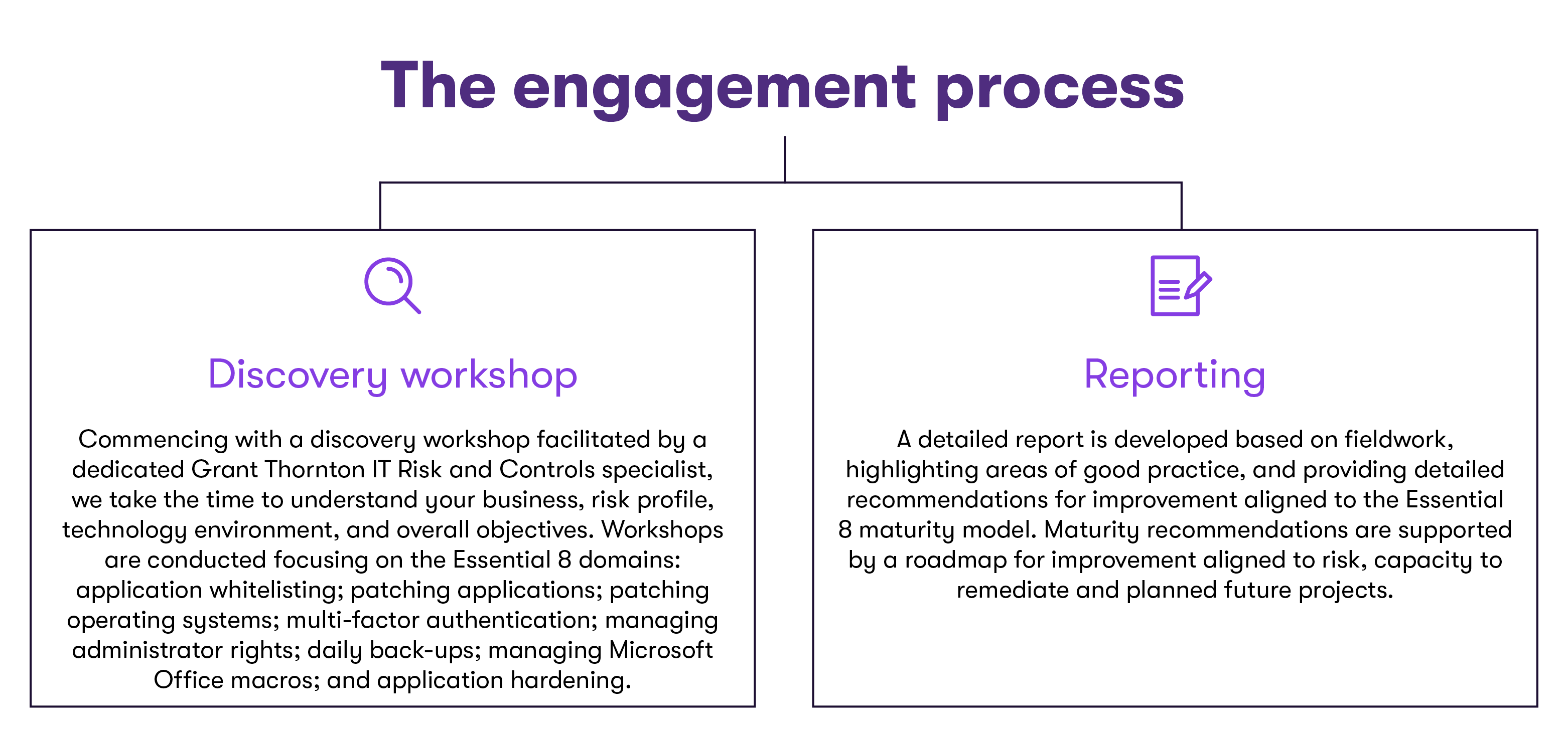 An Essential 8 Audit will provide detailed insight into your cyber security controls posture, providing you with detailed recommendations to improve your controls maturity, strength and resilience.