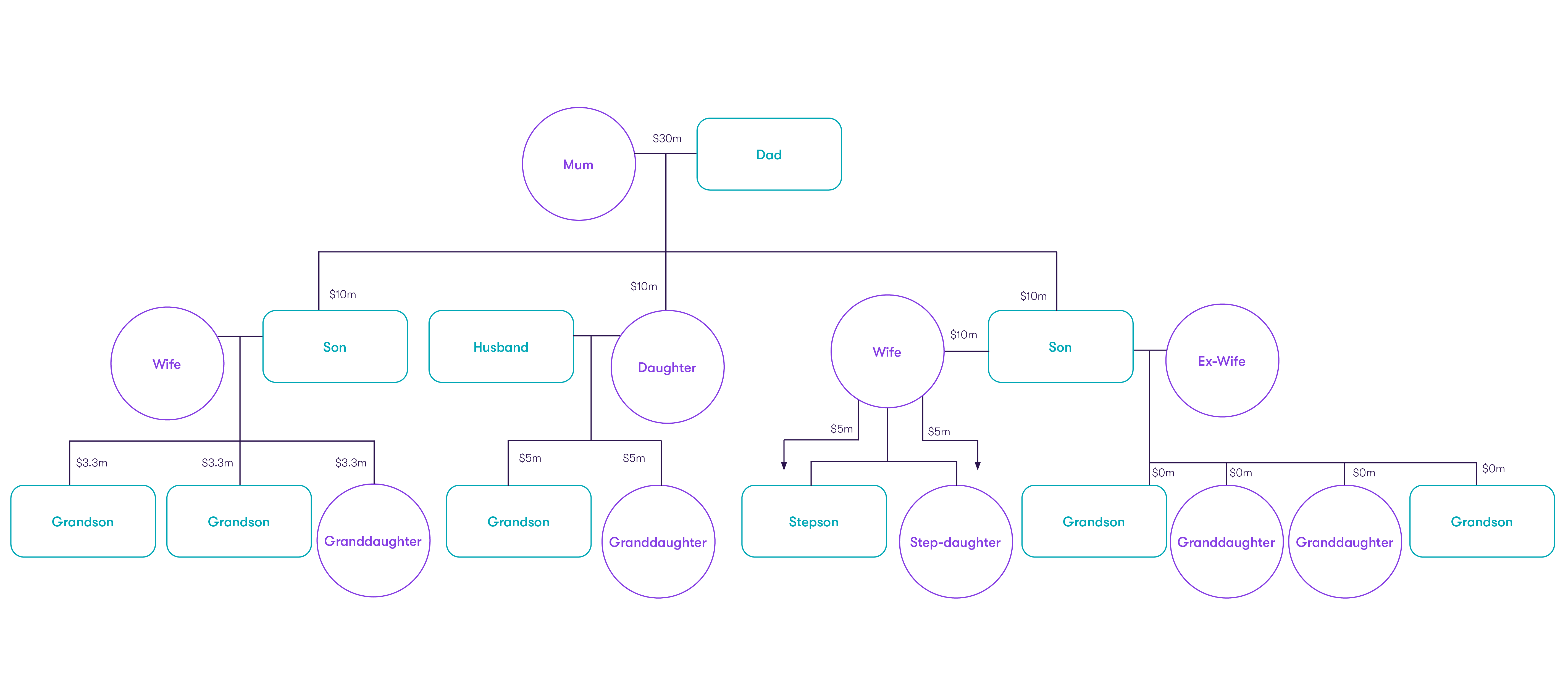 A husband and wife have accumulated $100m. As their children are already financially established, the wife is now focusing on providing financial stability to her grandchildren as her husband has passed away. One of her sons has recently remarried, and his will could request all wealth transfer to go to her, with a possibility the biological grandchildren might not inherit any of the wealth.
