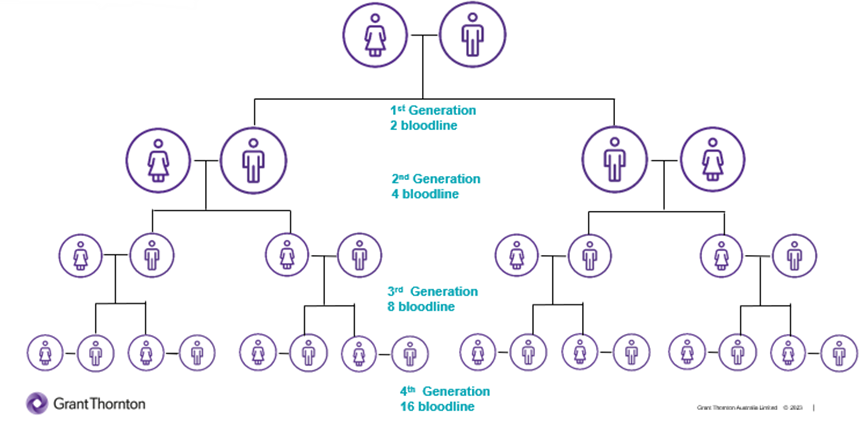 However, this sustainable legacy can sometimes be challenging to create. As the family tree shows below, once you look at third generation and beyond, families become larger. More complexities can need to be considered such as divorces, remarriages, step-children, blended and aging families. The family element in a family business starts to become very complex. You will begin to see family members in the business and family members removing themselves from the business.