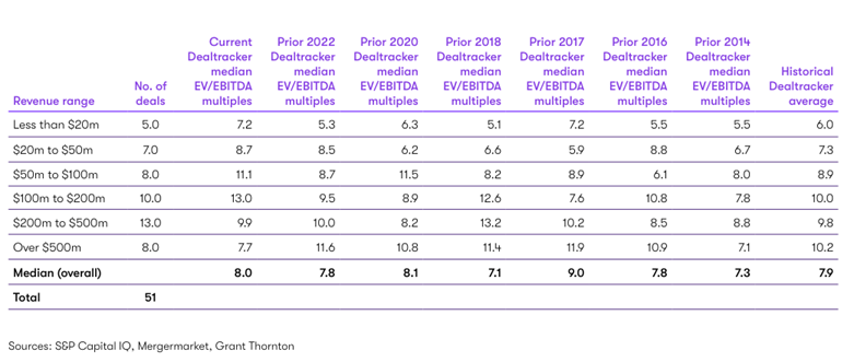 In the below extract of the Dealtracker 2023 report, the data shows that over the longer term (i.e. Historical Dealtracker average), businesses with revenue greater than $100m have transacted at broadly 10.0x EBITDA, with business with less than $20m in revenue transacting at 6.0x EBITDA, an implied discount of 40 per cent.