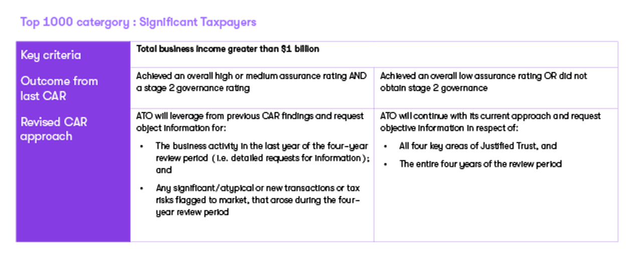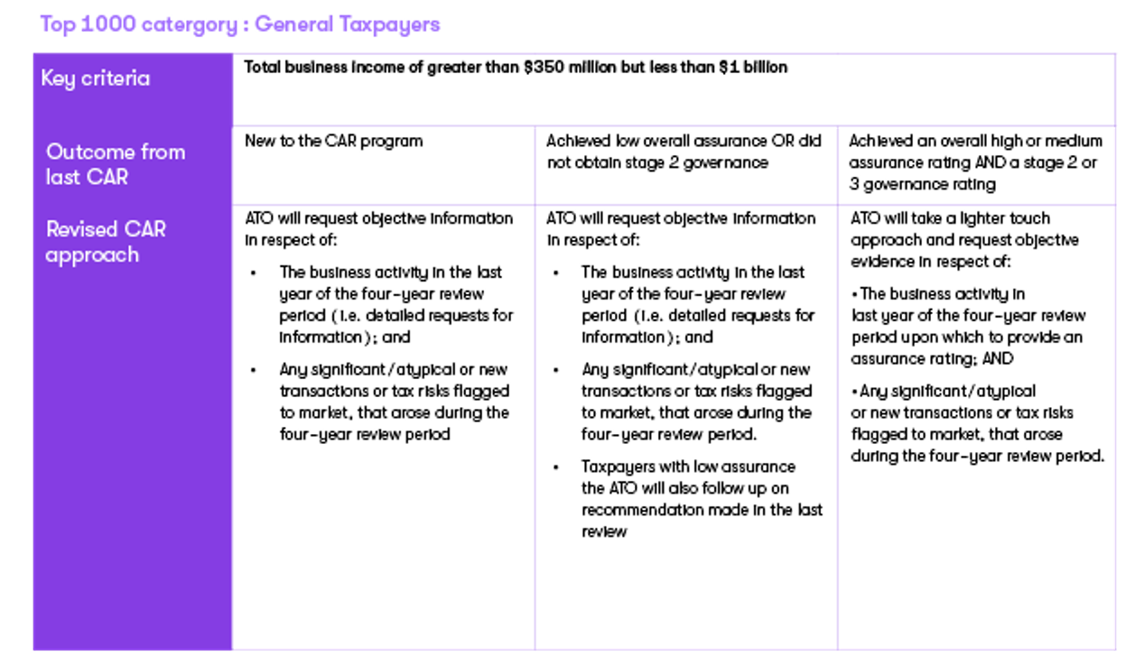 - The resulting Top 1000 population has been subdivided into two categories from an income tax perspective – ‘significant taxpayers’ and ‘general pool taxpayers’. The ATO will tailor the scope and nature of its CAR inquiries in the four-year review period, based on these new Top 1000 subcategories and the affected taxpayer’s previous CAR outcomes.