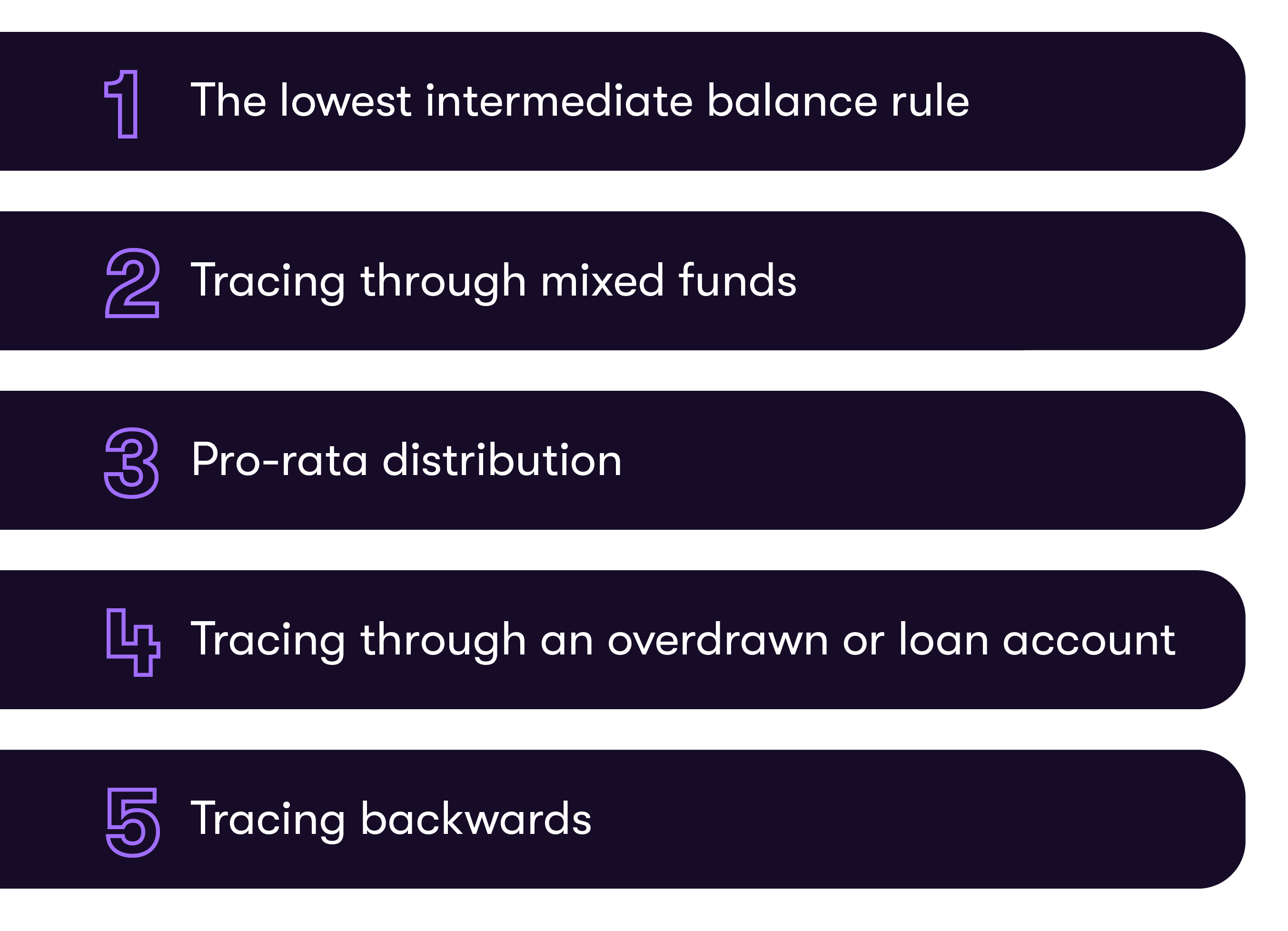 There are various complex apportionment and priority rules that can be applied to trace assets in a family law matter or commercial dispute, including: