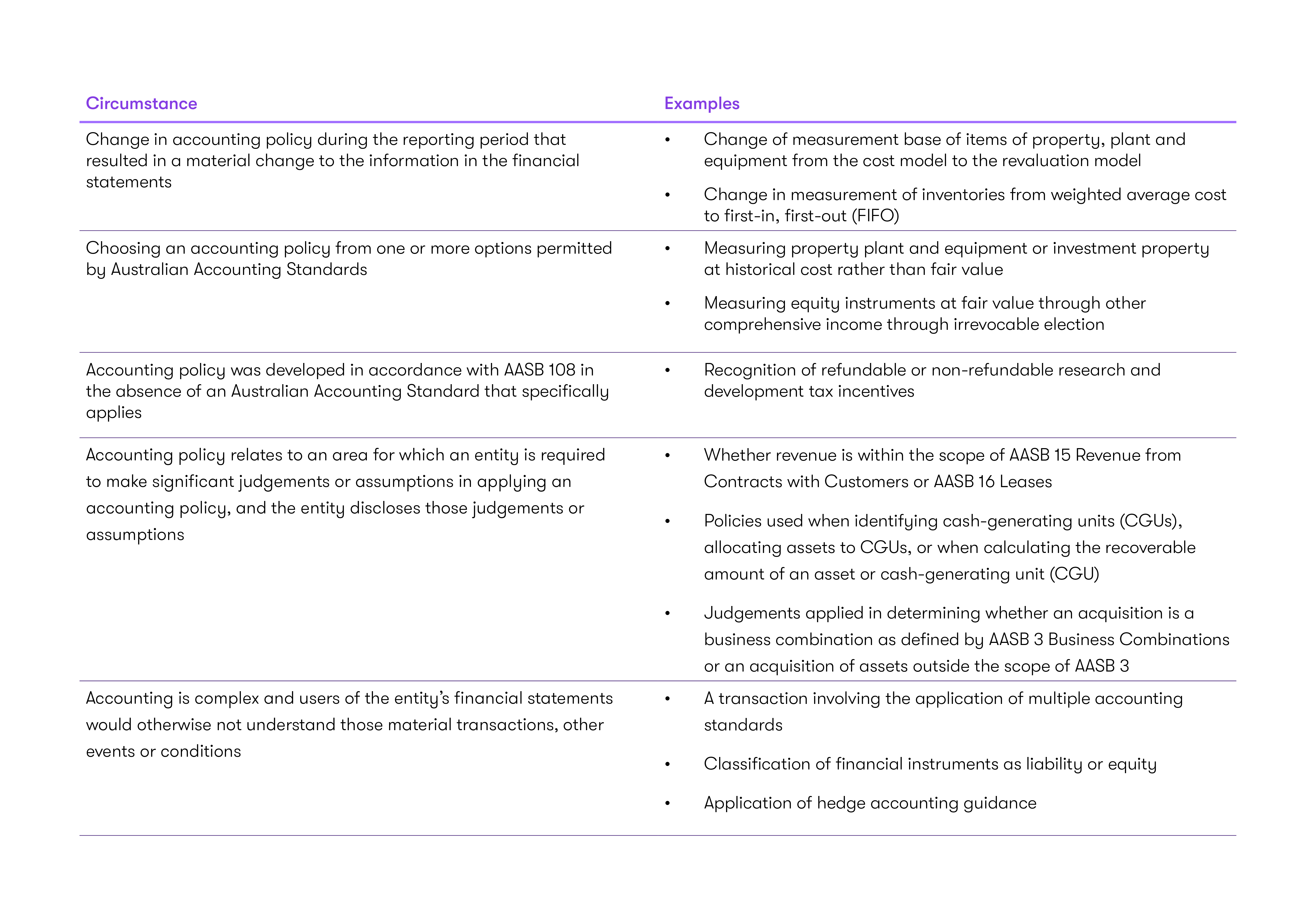 This change resulted from the fact that the term ‘significant’ is, unlike the term ‘material’, not defined in Australian Accounting Standards or other authoritative literature. The absence of definition gave rise to difficulties in assessing whether accounting policies were required to be included, resulting in diversity in practice.
